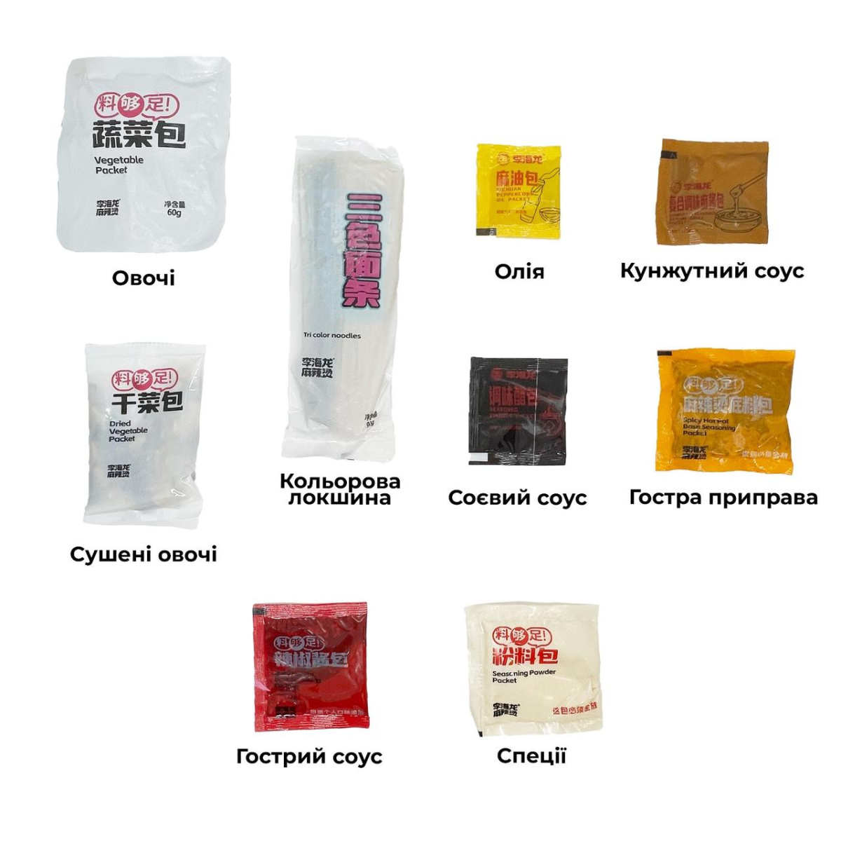 У наборі: кольорова локшина, овочі, сушені овочі, соєвий соус, кунжутний соус, ароматна олія, гостра приправа, гострий соус, спеції.